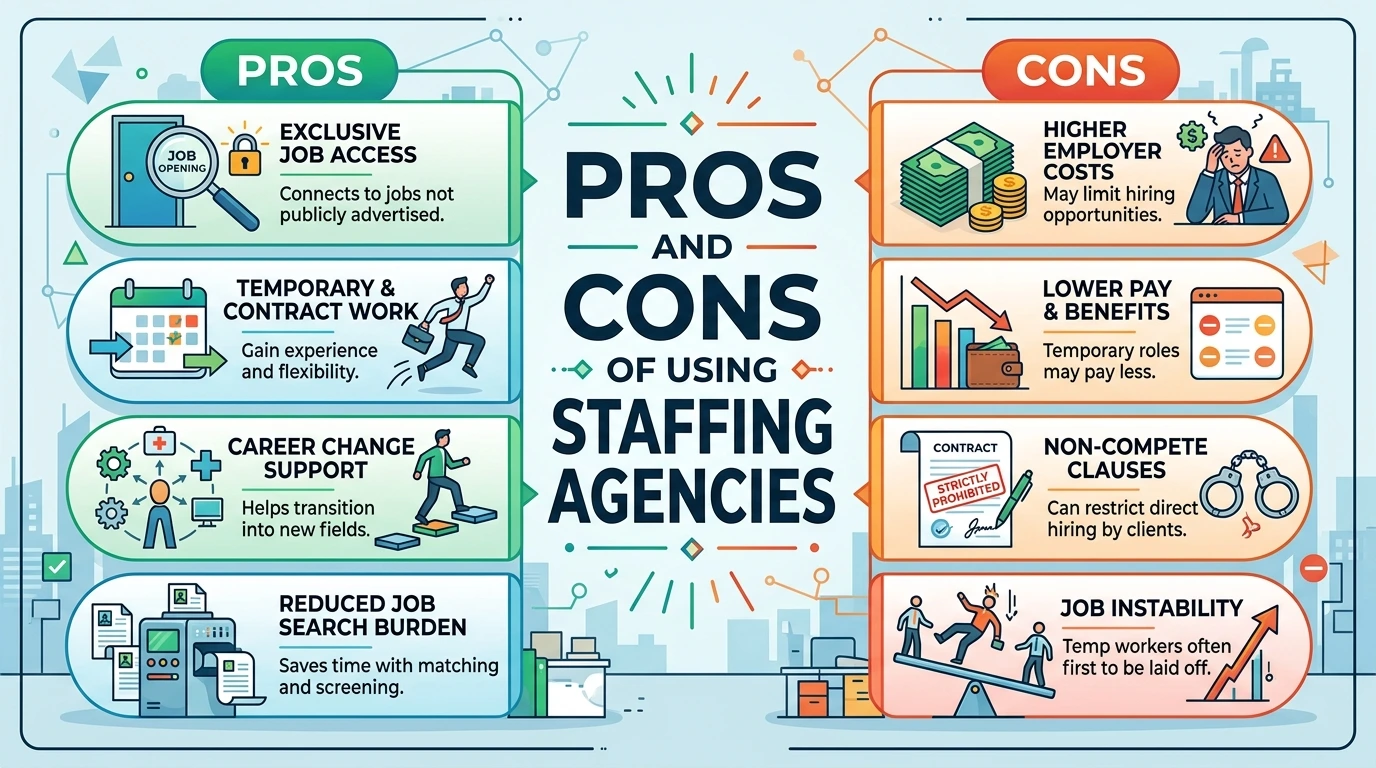 Potential downsides include limited permanent job opportunities, variable quality of job matches, agencies representing employer interests first, and some agencies providing less personalized attention.
