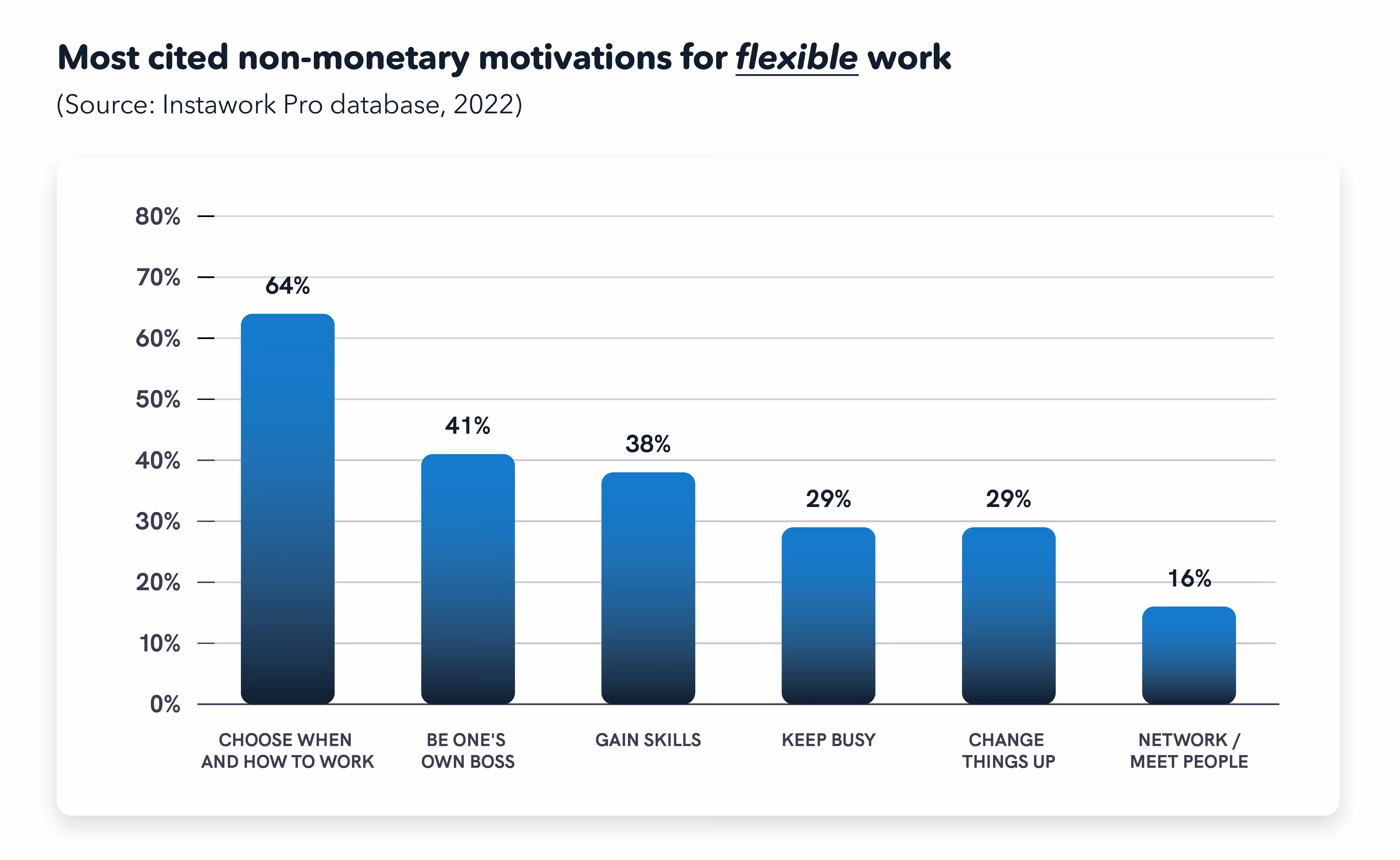 The State of the Flexible Workforce report is the first compendium of flexible workers' demographics, education, location, motivations, and conditions of employment. Using a combination of data from internal surveys, transactions on our platform, and government statistics, we've been able to describe flexible workers and highlight how they differ from hourly workers overall.