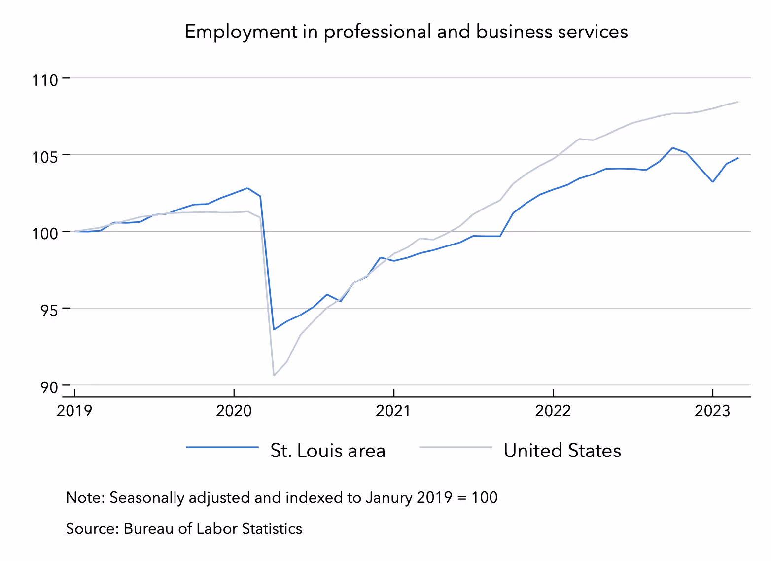 Once again, the St. Louis area rebounded earlier than the nation as a whole, then lagged behind. And this was true even for white-collar jobs, one of the few categories that were growing robustly before the pandemic in the St. Louis area:
