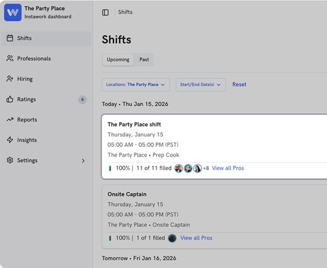 Instawork uses geo-tracking to confirm workers are en route and remain on-site for the full shift. Combined with upfront shift requirements like skills and attire, this helps reduce no-shows and limits last-minute disruptions.